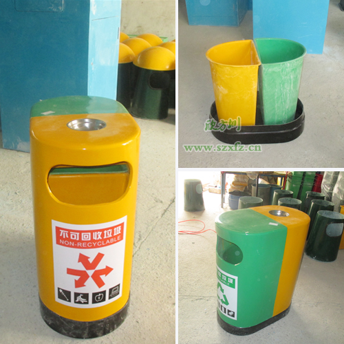 環(huán)保分類玻璃鋼垃圾桶 學(xué)校的首選深圳寶安沙井實驗學(xué)校,是欣方圳老顧客了。按照之前訂購的玻璃鋼垃圾桶樣板生產(chǎn),發(fā)實物照給工廠的廠長確認。A21玻璃鋼環(huán)保分類垃圾桶的規(guī)格為:680*400*850mm.這款垃圾桶來頭可不小哦,它是獲得了專利外觀設(shè)計的玻璃鋼垃圾桶。每個產(chǎn)品是經(jīng)過的嚴格生產(chǎn)程序制造出來,貼上產(chǎn)品合格證,符合企業(yè)高品質(zhì)標準。玻璃鋼垃圾桶一邊嫩綠,一邊中絡(luò)黃,底座黑色,外加一個煙灰缸巧妙的搭配,簡潔、美觀。桶蓋/桶身采用FRP玻璃鋼復(fù)合材料制造,具有防腐、防盜、防生銹、易清潔等特點,表面涂層采用高分子耐老化膠衣涂層,色澤明快、持久。