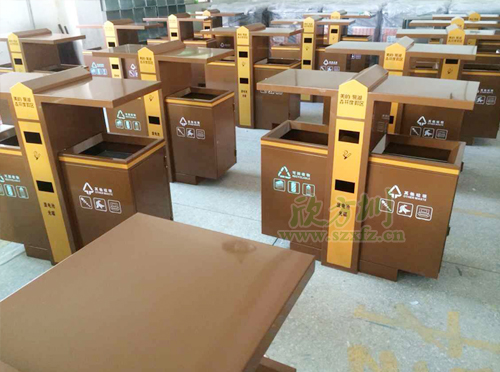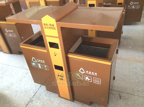 土豪金垃圾桶獨特設計風格F238戶外分類垃圾桶,外桶為足1.2mm鍍鋅板,表面噴塑工藝,內膽為201#,厚足0.75mm, 螺絲螺母為304不銹鋼材質,采用不銹鋼膨脹螺 安裝。噴塑顏色為土豪金色,垃圾桶開口位置坐折邊處理,箱體帶簡易防盜鎖。左右兩邊分別絲印,可回收物,其他垃圾等圖案標志。中間橙黃色區(qū)域,印有美的·鷺湖森林度假區(qū),廢電池光碟字樣,字體顏色為土豪金色。欣方圳工程師采用金色的獨特性的設計風格,特別受到物業(yè),房地產,機場,小區(qū)等單位的青睞。