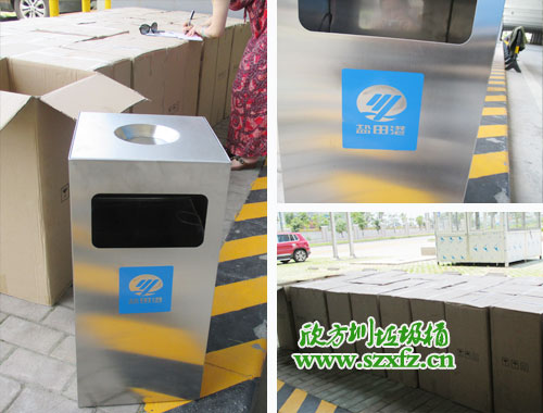 本款不銹鋼垃圾桶是按照貴司的常規(guī)熱銷款C60方形不銹鋼果皮箱改造而來的,其規(guī)格為:350*350*680mm。不銹鋼垃圾桶外觀不銹鋼色澤,常規(guī)不銹鋼垃圾桶桶部上面絲印有禁煙標(biāo)志,按照顧客的要求改造為桶上方凹圓形槽,用于裝置煙灰頭。不銹鋼垃圾桶桶的正面,旁邊用藍(lán)色搭配絲印,鹽田港三個(gè)字及LOGO跟不銹鋼垃圾桶色澤一致,金屬亮澤 ,高雅美觀。