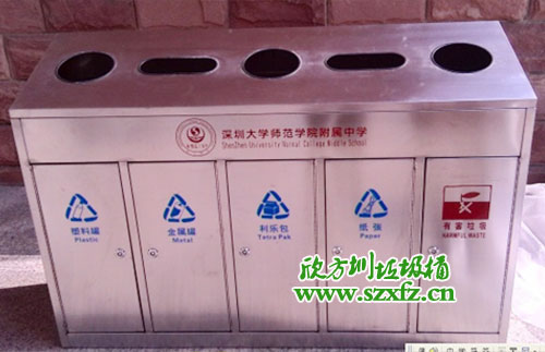 深圳師范學(xué)院附屬中學(xué)款式的C170五分類環(huán)保回收箱規(guī)格為:1600*400*860mm.外表是一款全新不銹鋼材質(zhì)打造而成.不銹鋼垃圾桶頂部有五個(gè)垃圾投放組合,圓形垃圾投口分別左,右,中間,還有兩個(gè)半圓在中間部位。不銹鋼垃圾桶正面開(kāi)有五個(gè)門(mén),每一個(gè)門(mén)前都有一個(gè)小鑰匙配套開(kāi)門(mén)。正面中間橫幅有LOGO的標(biāo)準(zhǔn),還有深圳大學(xué)師范學(xué)院附屬中學(xué)字樣及英文拼音字母組合而成。不銹鋼垃圾桶五個(gè)取放垃圾內(nèi)膽正門(mén),絲印有五個(gè)垃圾投放標(biāo)志。從左到右依次回收塑料罐,金屬罐,利樂(lè)包,紙張,有害垃圾及標(biāo)志。不銹鋼垃圾桶外觀為方形,具有獨(dú)特的堅(jiān)固耐用,不易破損;耐火安全,抗高低溫等優(yōu)勢(shì)。適合各大院校,高檔場(chǎng)所使用。