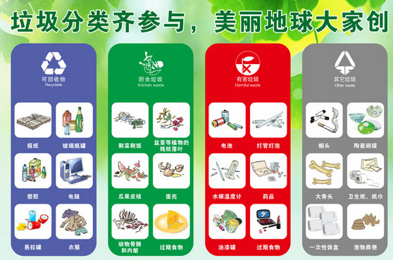 (5)布料:主要包括廢棄衣服、桌布、毛巾、布包等 如每回收1噸廢紙可造好紙850公斤,節(jié)省木材300公斤,比等量生產(chǎn)減少污染74%;每回收1噸塑料飲料瓶可獲得0.7噸二級原料;每回收1噸廢鋼鐵可煉好鋼0.9噸,比用礦石冶煉節(jié)約成本47%,減少空氣污染75%,減少97%的水污染和固體廢物。 可回收物以外的垃圾基本上都是廢棄物。比如煙頭、雞毛、廢電、煤渣、建筑垃圾、油漆顏料、食品殘留物等等。 有毒垃圾,包括廢電池、日光燈管、水銀溫度計、油漆筒、藥品、化妝品等。 垃圾是放錯了地方的財富。