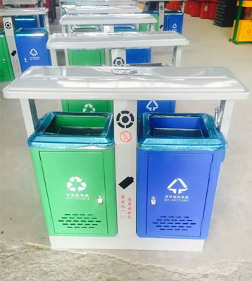 欣方圳戶外鋼制環(huán)保分類垃圾桶車間批量生產(chǎn)圖