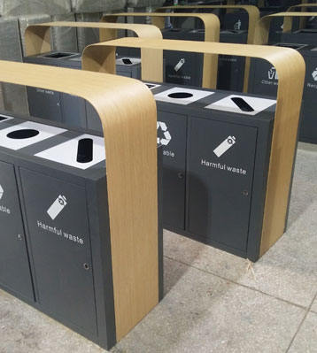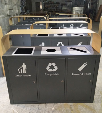 東莞樓盤定制戶外三分類仿木紋鋼制烤漆垃圾桶