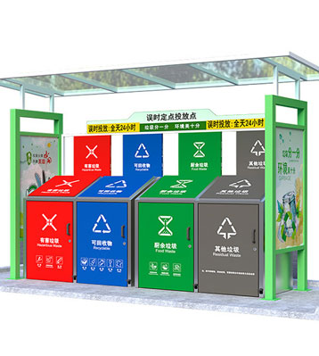 設(shè)有擋雨棚,可配備垃圾箱信息顯示屏、防水照明燈、廣告屏,進(jìn)行地面硬化。對(duì)社區(qū)玻金塑紙可回收物,其他垃圾,廚余垃圾,有害垃圾等生活垃圾定時(shí)定點(diǎn)投放收集.