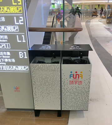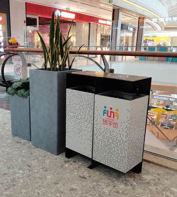 欣方圳商場不銹鋼烤漆景觀分類垃圾箱現(xiàn)場擺放圖